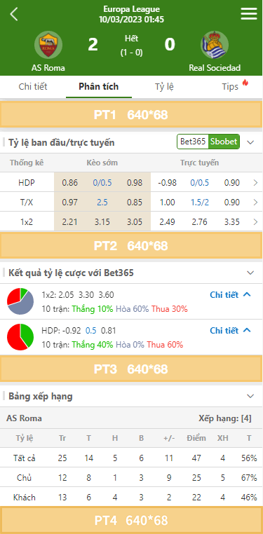 Các vị trí trên trang Chi tiết bóng đá